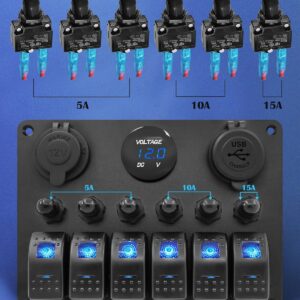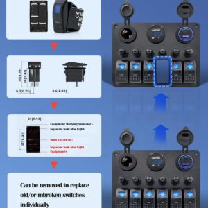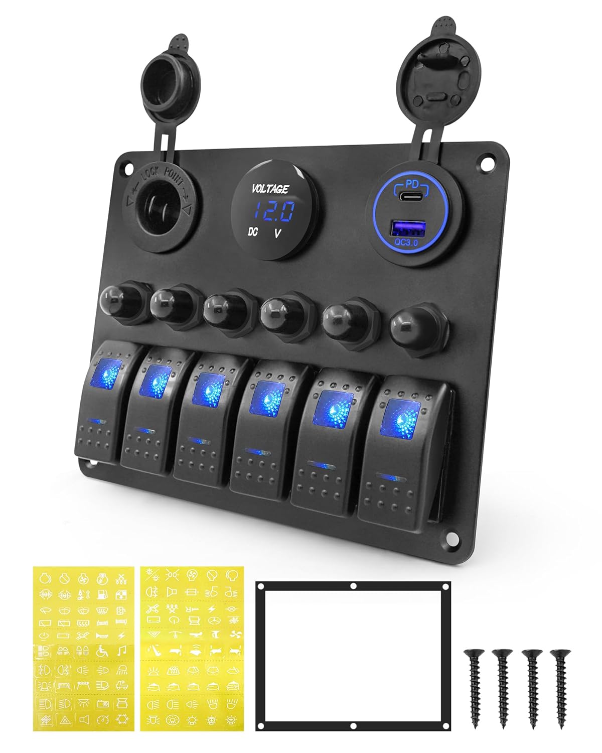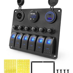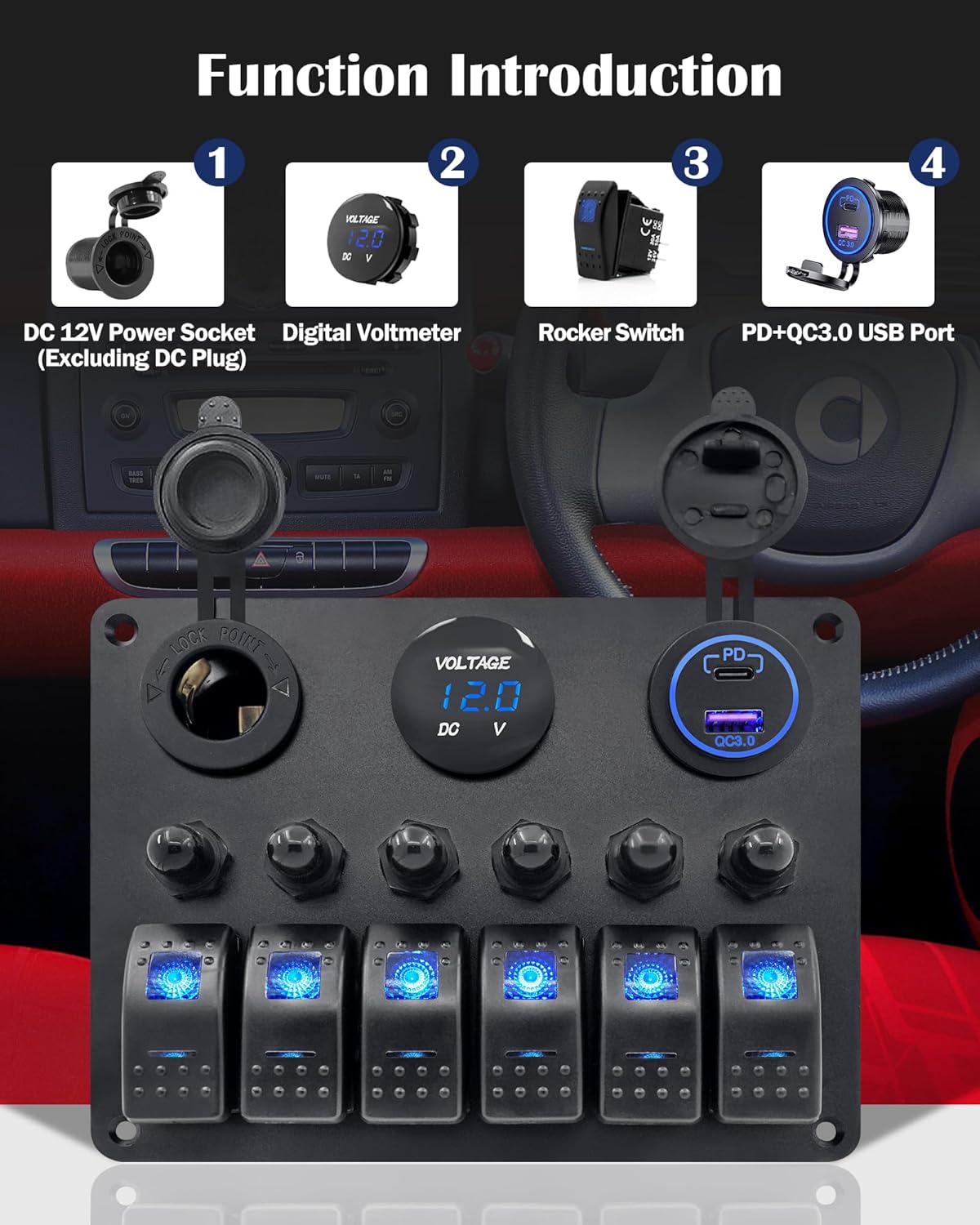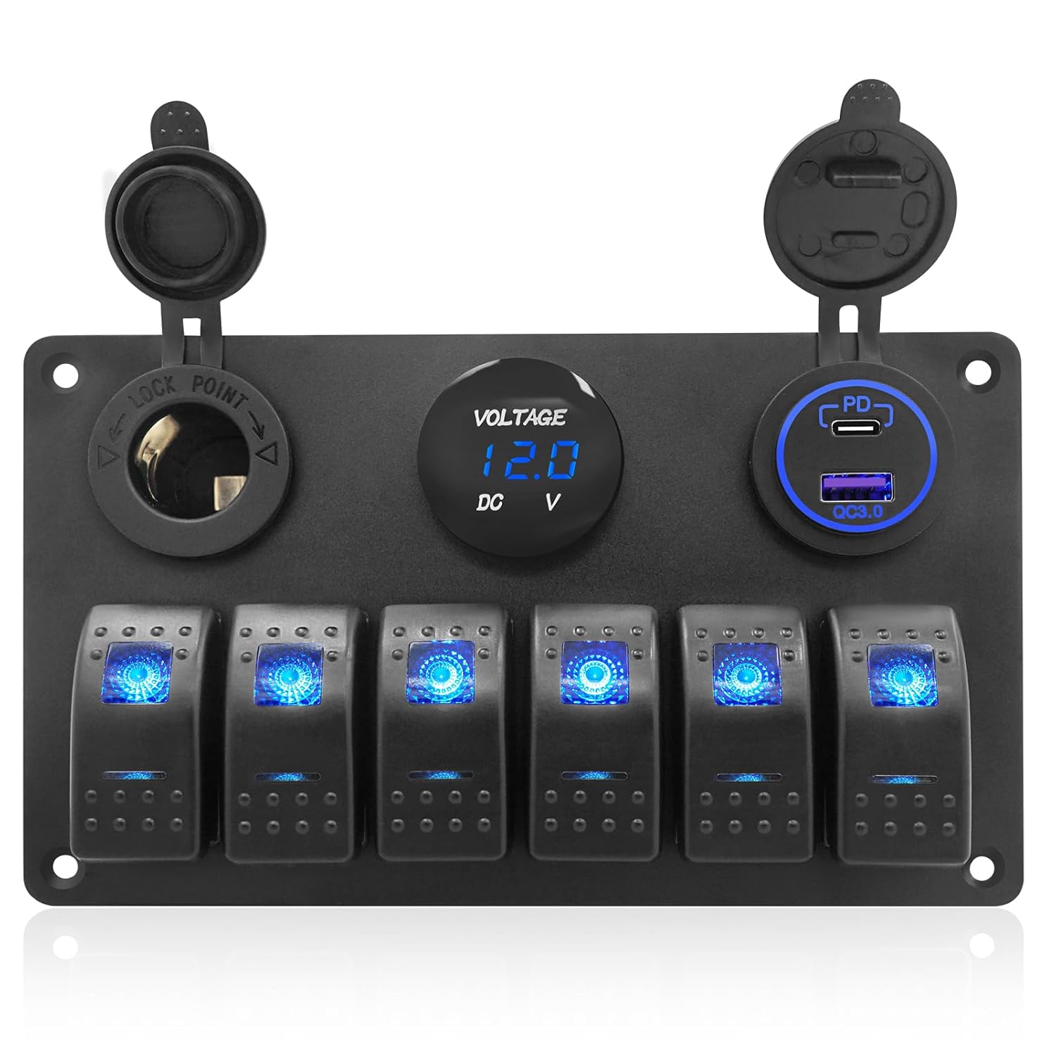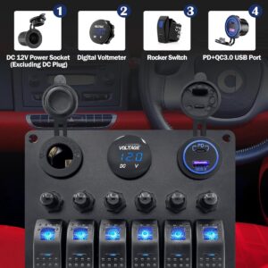 Aluminum 6 Gang Marine Rocker Switch Panel Waterproof for Boat Circuit Breaker Protected, Digital Voltage Display, PD QC3.0 USB Port,12V DC Power Socket for Trailer Bus Car Truck RV Vehicles Yacht