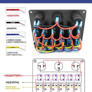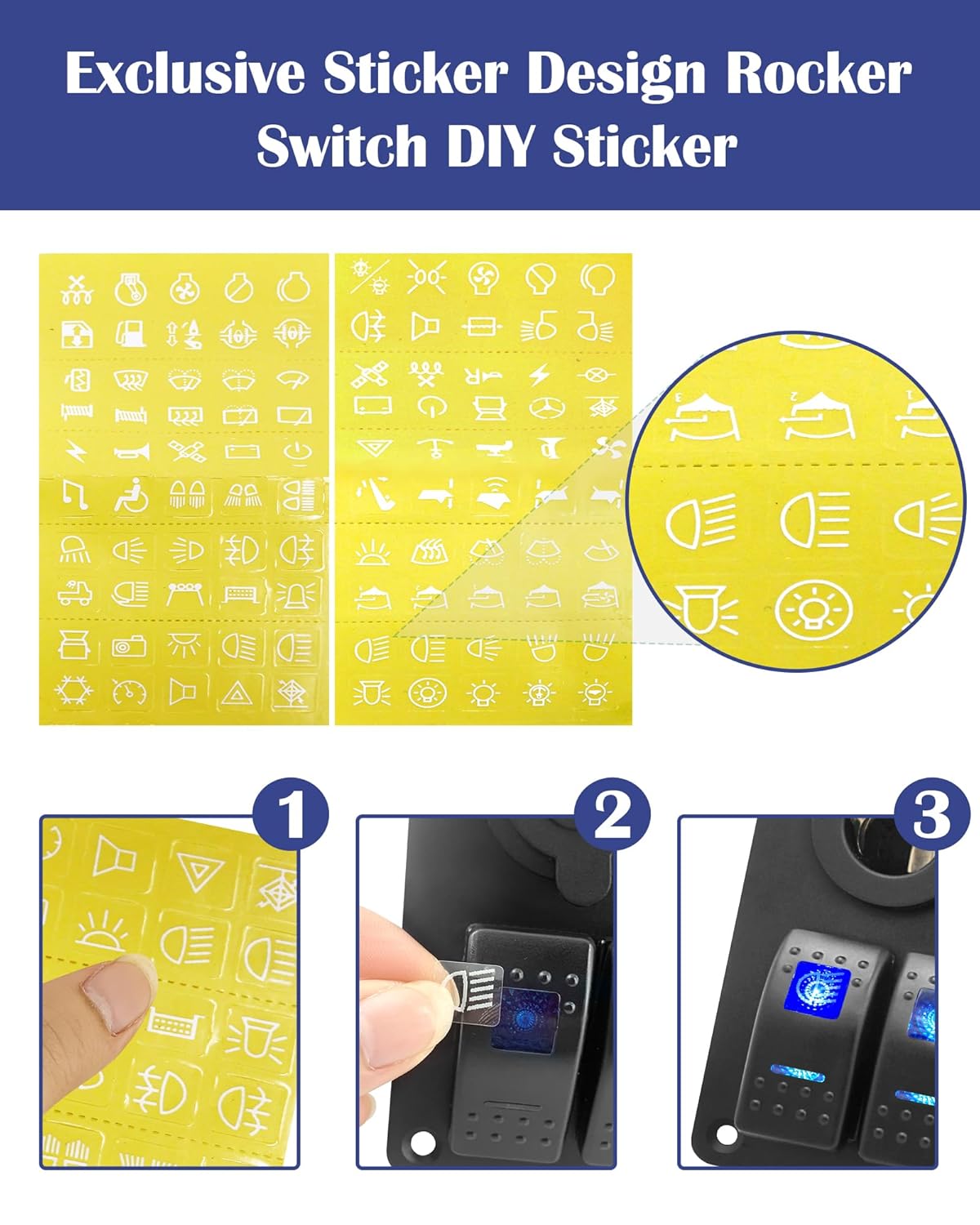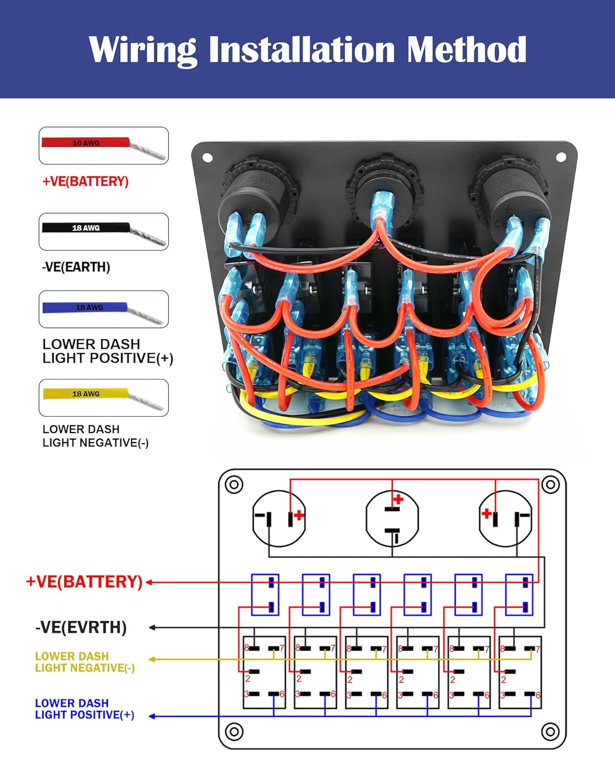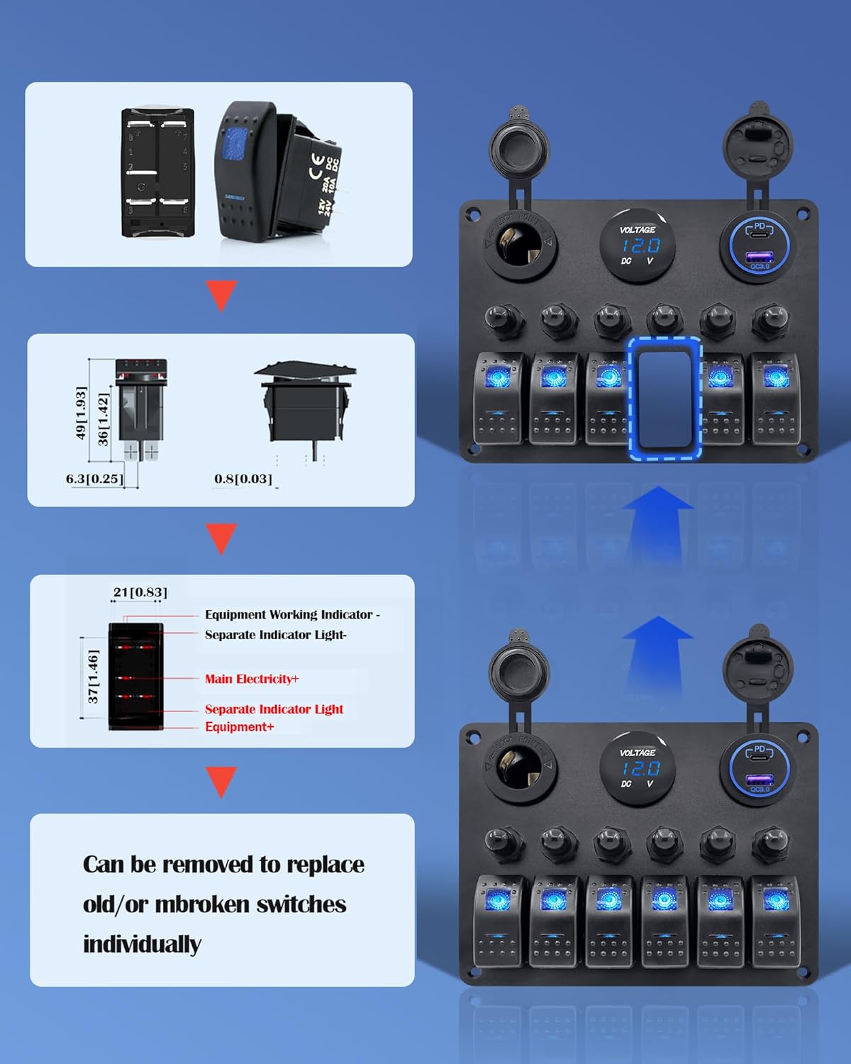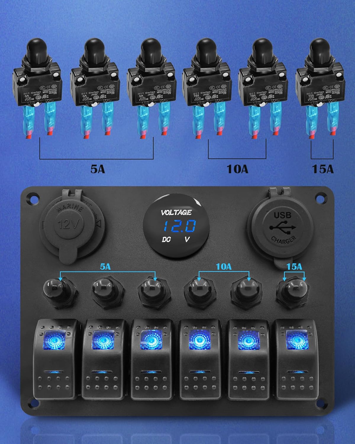 Aluminum 6 Gang Marine Rocker Switch Panel Waterproof for Boat Circuit Breaker Protected, Digital Voltage Display, PD QC3.0 USB Port,12V DC Power Socket for Trailer Bus Car Truck RV Vehicles Yacht