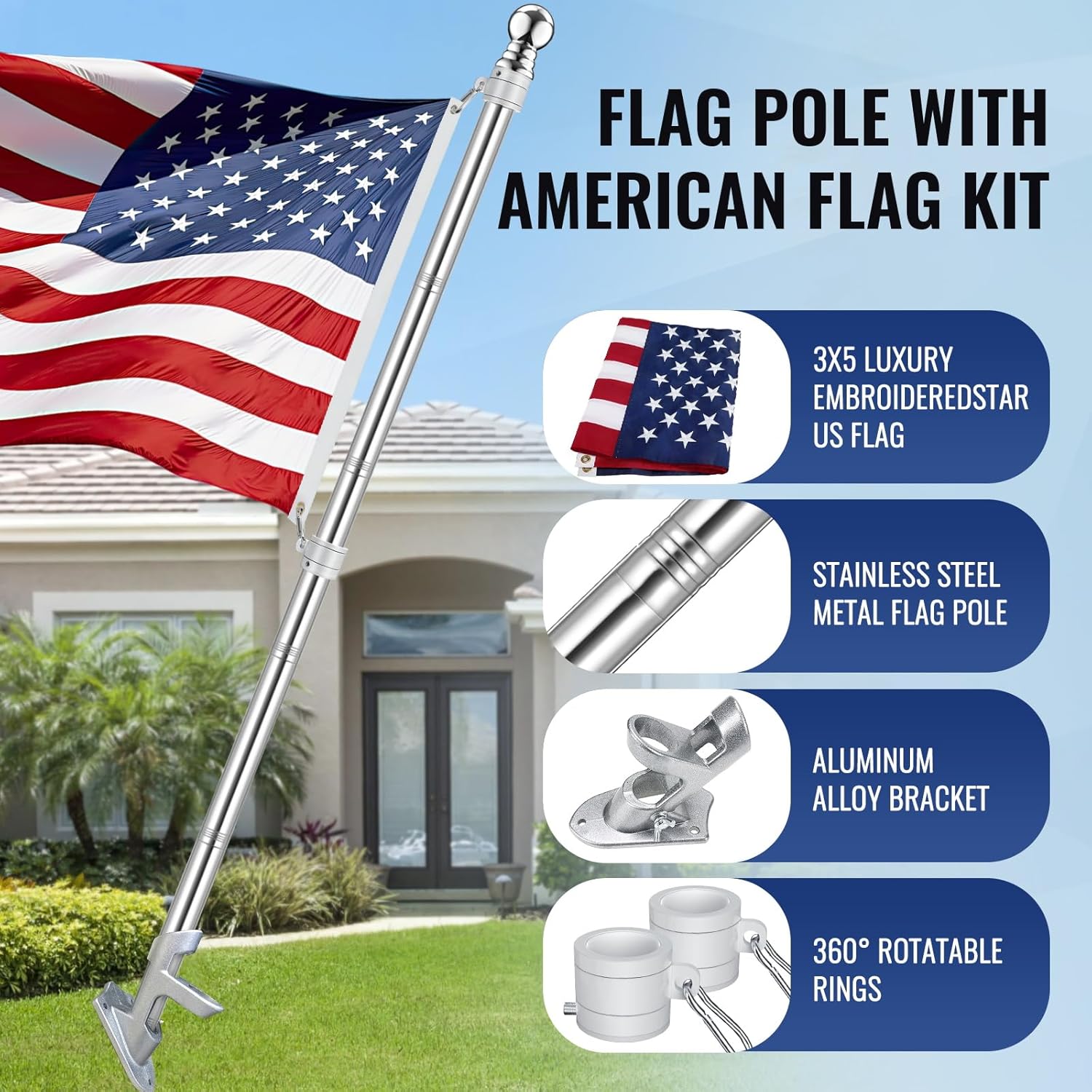 American Flag Pole Kit, Including 100% Polyester 3×5 ft US Flag, 5 Ft Aluminum White No Tangle Spinning Pole and Multi-Position Flag Pole Bracket