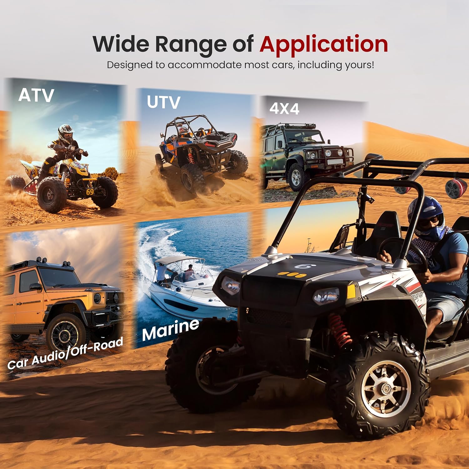 - Used for Off-Road Outdoor Vehicles: ATV, UTV, 4×4, Jeeps, Marine Watercraft